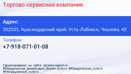 Торгово-сервисная компания по адресу 352331, Краснодарский край, Усть-Лабинск, Чкалова, 42 в дальнейшем Организация, размещена в следующих категориях: