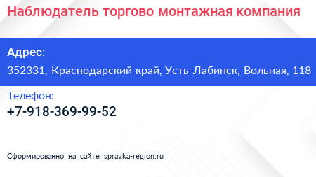 Наблюдатель, торгово-монтажная компания по адресу 352331, Краснодарский край, Усть-Лабинск, Вольная, 118 в дальнейшем Организация, размещена в следующих категориях: