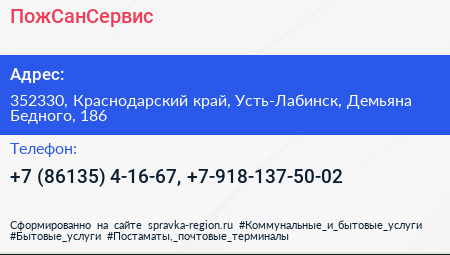 ПожСанСервис по адресу 352330, Краснодарский край, Усть-Лабинск, Демьяна Бедного, 186 в дальнейшем Организация, размещена в следующих категориях: