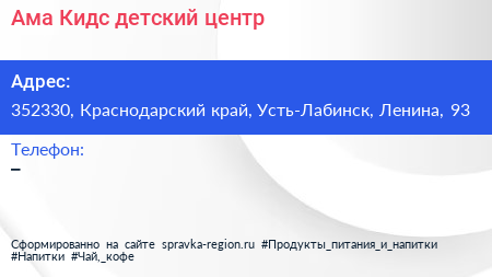 Ама Кидс, детский центр по адресу 352330, Краснодарский край, Усть-Лабинск, Ленина, 93 в дальнейшем Организация, размещена в следующих категориях: