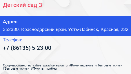 Детский сад №3 по адресу 352330, Краснодарский край, Усть-Лабинск, Красная, 232 в дальнейшем Организация, размещена в следующих категориях:
