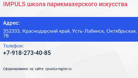 IMPULS, школа парикмахерского искусства по адресу 352333, Краснодарский край, Усть-Лабинск, Октябрьская, 78 в дальнейшем Организация, размещена в следующих категориях: