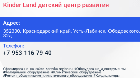 Kinder Land, детский центр развития по адресу 352330, Краснодарский край, Усть-Лабинск, Ободовского, 32д в дальнейшем Организация, размещена в следующих категориях: