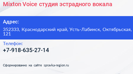 Mixton Voice, студия эстрадного вокала по адресу 352333, Краснодарский край, Усть-Лабинск, Октябрьская, 121 в дальнейшем Организация, размещена в следующих категориях: