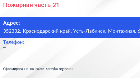 Пожарная часть №21 по адресу 352332, Краснодарский край, Усть-Лабинск, Монтажная, 6 в дальнейшем Организация, размещена в следующих категориях: