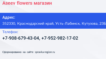 Aseev flowers, магазин по адресу 352330, Краснодарский край, Усть-Лабинск, Кутузова, 23Б в дальнейшем Организация, размещена в следующих категориях: