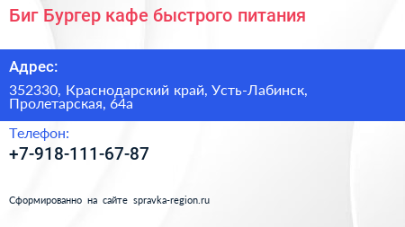 Биг Бургер, кафе быстрого питания по адресу 352330, Краснодарский край, Усть-Лабинск, Пролетарская, 64а в дальнейшем Организация, размещена в следующих категориях: