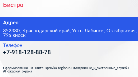 Бистро по адресу 352330, Краснодарский край, Усть-Лабинск, Октябрьская, 79а киоск в дальнейшем Организация, размещена в следующих категориях: