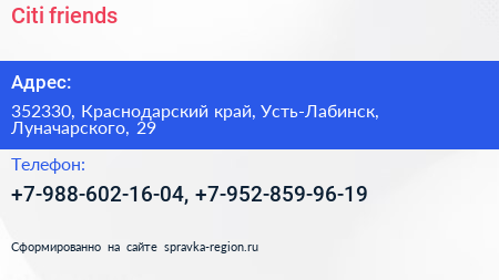 Citi friends по адресу 352330, Краснодарский край, Усть-Лабинск, Луначарского, 29 в дальнейшем Организация, размещена в следующих категориях: