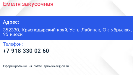Емеля, закусочная по адресу 352330, Краснодарский край, Усть-Лабинск, Октябрьская, 95 киоск в дальнейшем Организация, размещена в следующих категориях: