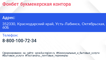 Фонбет, букмекерская контора по адресу 352330, Краснодарский край, Усть-Лабинск, Октябрьская, 60Б в дальнейшем Организация, размещена в следующих категориях: