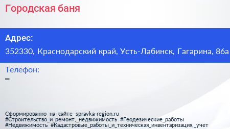 Городская баня по адресу 352330, Краснодарский край, Усть-Лабинск, Гагарина, 86а в дальнейшем Организация, размещена в следующих категориях: