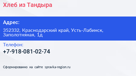 Хлеб из Тандыра по адресу 352332, Краснодарский край, Усть-Лабинск, Заполотняная, 1д в дальнейшем Организация, размещена в следующих категориях:
