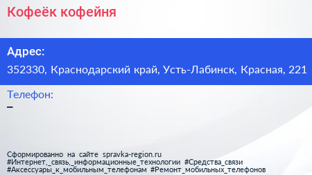 Кофеёк, кофейня по адресу 352330, Краснодарский край, Усть-Лабинск, Красная, 221 в дальнейшем Организация, размещена в следующих категориях: