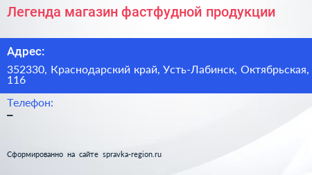 Легенда, магазин фастфудной продукции по адресу 352330, Краснодарский край, Усть-Лабинск, Октябрьская, 116 в дальнейшем Организация, размещена в следующих категориях:
