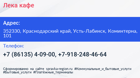 Лека, кафе по адресу 352330, Краснодарский край, Усть-Лабинск, Коминтерна, 101 в дальнейшем Организация, размещена в следующих категориях: