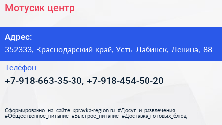 Мотусик, центр по адресу 352333, Краснодарский край, Усть-Лабинск, Ленина, 88 в дальнейшем Организация, размещена в следующих категориях: