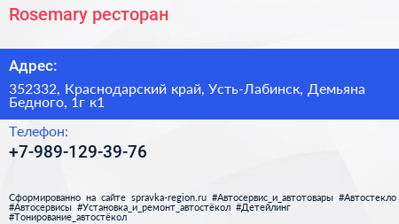 Rosemary, ресторан по адресу 352332, Краснодарский край, Усть-Лабинск, Демьяна Бедного, 1г к1 в дальнейшем Организация, размещена в следующих категориях:
