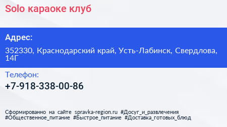 Solo, караоке-клуб по адресу 352330, Краснодарский край, Усть-Лабинск, Свердлова, 14Г в дальнейшем Организация, размещена в следующих категориях:
