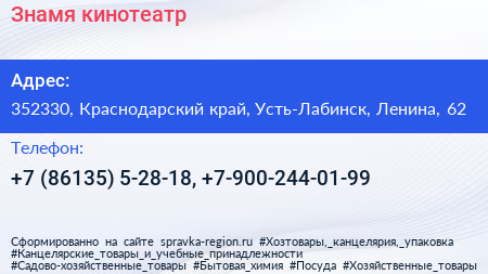Знамя, кинотеатр по адресу 352330, Краснодарский край, Усть-Лабинск, Ленина, 62 в дальнейшем Организация, размещена в следующих категориях: