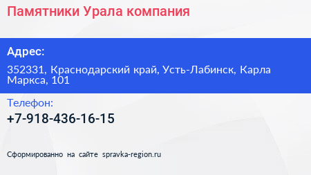 Памятники Урала, компания по адресу 352331, Краснодарский край, Усть-Лабинск, Карла Маркса, 101 в дальнейшем Организация, размещена в следующих категориях: