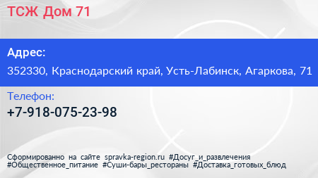 ТСЖ Дом-71 по адресу 352330, Краснодарский край, Усть-Лабинск, Агаркова, 71 в дальнейшем Организация, размещена в следующих категориях: