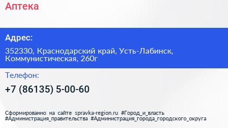 Аптека по адресу 352330, Краснодарский край, Усть-Лабинск, Коммунистическая, 260г в дальнейшем Организация, размещена в следующих категориях: