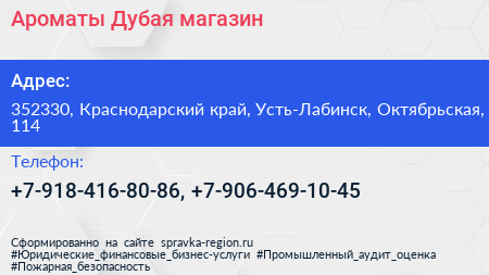 Ароматы Дубая, магазин по адресу 352330, Краснодарский край, Усть-Лабинск, Октябрьская, 114 в дальнейшем Организация, размещена в следующих категориях: