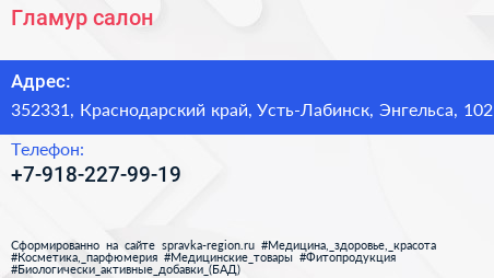 Гламур, салон по адресу 352331, Краснодарский край, Усть-Лабинск, Энгельса, 102 в дальнейшем Организация, размещена в следующих категориях: