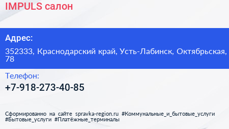 IMPULS, салон по адресу 352333, Краснодарский край, Усть-Лабинск, Октябрьская, 78 в дальнейшем Организация, размещена в следующих категориях: