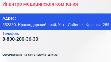 Инвитро, медицинская компания по адресу 352330, Краснодарский край, Усть-Лабинск, Красная, 285 в дальнейшем Организация, размещена в следующих категориях:
