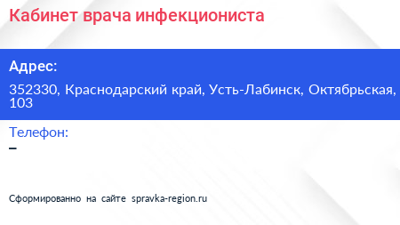 Кабинет врача-инфекциониста по адресу 352330, Краснодарский край, Усть-Лабинск, Октябрьская, 103 в дальнейшем Организация, размещена в следующих категориях: