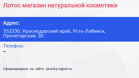Лотос, магазин натуральной косметики по адресу 352330, Краснодарский край, Усть-Лабинск, Пролетарская, 30 в дальнейшем Организация, размещена в следующих категориях: