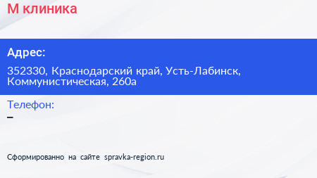 М, клиника по адресу 352330, Краснодарский край, Усть-Лабинск, Коммунистическая, 260а в дальнейшем Организация, размещена в следующих категориях: