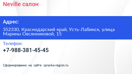 Neville, салон по адресу 352330, Краснодарский край, Усть-Лабинск, улица Марины Овсянниковой, 15 в дальнейшем Организация, размещена в следующих категориях: