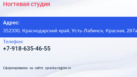 Ногтевая студия по адресу 352330, Краснодарский край, Усть-Лабинск, Красная, 287а в дальнейшем Организация, размещена в следующих категориях: