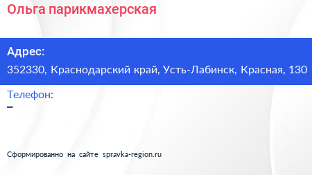 Ольга, парикмахерская по адресу 352330, Краснодарский край, Усть-Лабинск, Красная, 130 в дальнейшем Организация, размещена в следующих категориях: