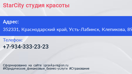 #StarCity, студия красоты по адресу 352331, Краснодарский край, Усть-Лабинск, Клепикова, 89 в дальнейшем Организация, размещена в следующих категориях: