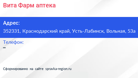 Вита-Фарм, аптека по адресу 352331, Краснодарский край, Усть-Лабинск, Вольная, 53а в дальнейшем Организация, размещена в следующих категориях: