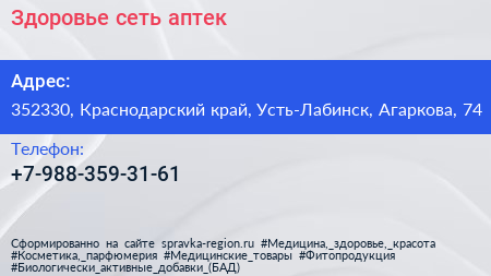 Здоровье, сеть аптек по адресу 352330, Краснодарский край, Усть-Лабинск, Агаркова, 74 в дальнейшем Организация, размещена в следующих категориях: