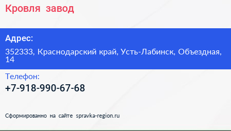 Кровля+, завод по адресу 352333, Краснодарский край, Усть-Лабинск, Объездная, 14 в дальнейшем Организация, размещена в следующих категориях: