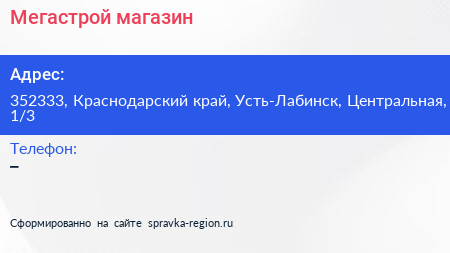 Мегастрой, магазин по адресу 352333, Краснодарский край, Усть-Лабинск, Центральная, 1/3 в дальнейшем Организация, размещена в следующих категориях: