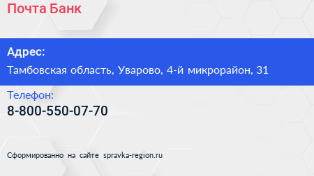 Почта Банк по адресу Тамбовская область, Уварово, 4-й микрорайон, 31 в дальнейшем Организация, размещена в следующих категориях: