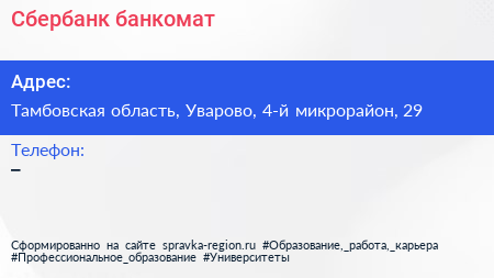 Сбербанк, банкомат по адресу Тамбовская область, Уварово, 4-й микрорайон, 29 в дальнейшем Организация, размещена в следующих категориях: