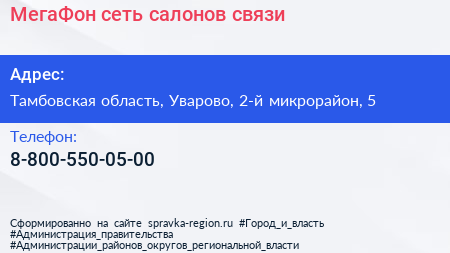 МегаФон, сеть салонов связи по адресу Тамбовская область, Уварово, 2-й микрорайон, 5 в дальнейшем Организация, размещена в следующих категориях: