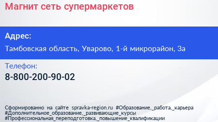 Магнит, сеть супермаркетов по адресу Тамбовская область, Уварово, 1-й микрорайон, 3а в дальнейшем Организация, размещена в следующих категориях: