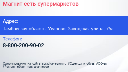 Магнит, сеть супермаркетов по адресу Тамбовская область, Уварово, Заводская улица, 75а в дальнейшем Организация, размещена в следующих категориях: