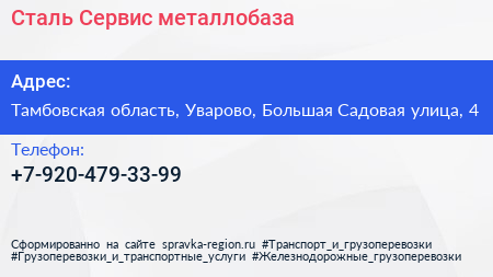 Сталь Сервис, металлобаза по адресу Тамбовская область, Уварово, Большая Садовая улица, 4 в дальнейшем Организация, размещена в следующих категориях: