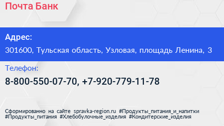 Почта Банк по адресу 301600, Тульская область, Узловая, площадь Ленина, 3 в дальнейшем Организация, размещена в следующих категориях: