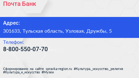 Почта Банк по адресу 301633, Тульская область, Узловая, Дружбы, 5 в дальнейшем Организация, размещена в следующих категориях: